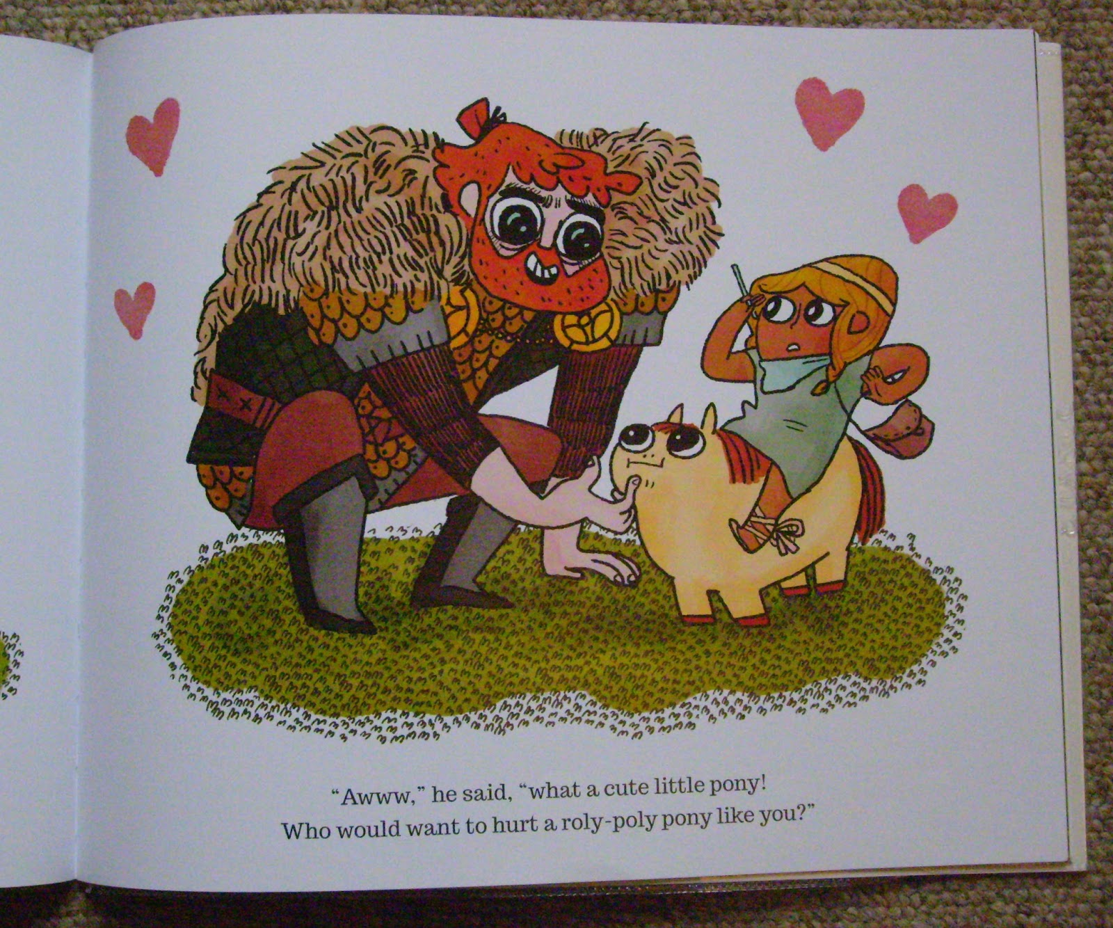 Published by Walker Books. In a kingdom of warriors, Princess Pinecone wants nothing less than a warhorse for her birthday - but she gets a cute little pony. This is a charming story, rich in character and comic detail. The illustration carefully bridges design from ancient civilisations (through pattern, line-work and colour) with something more contemporary. I think a good example of this is in the page below, where the evocative design and line-work of Otto also accomodates gooey eyes and love hearts.